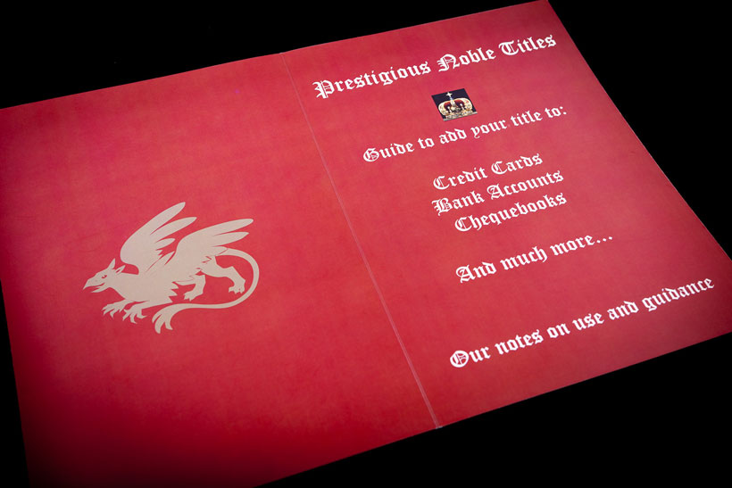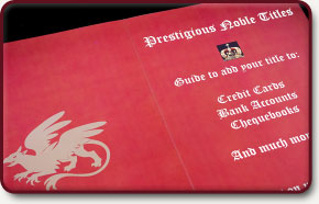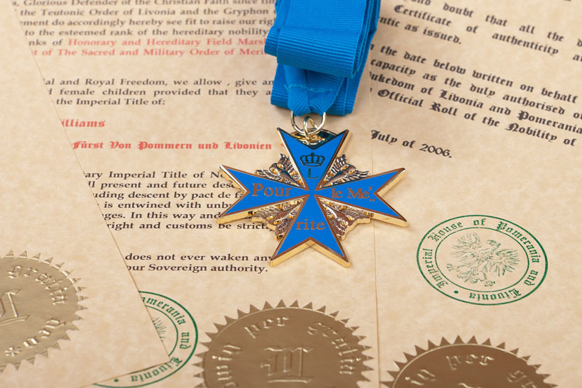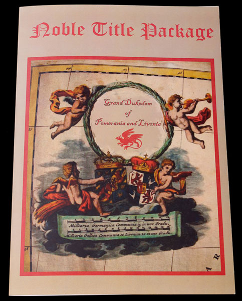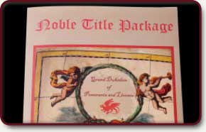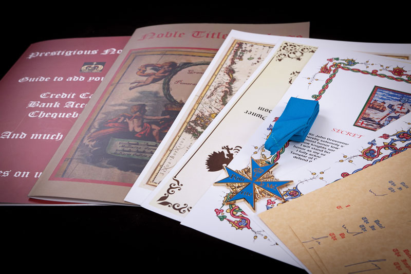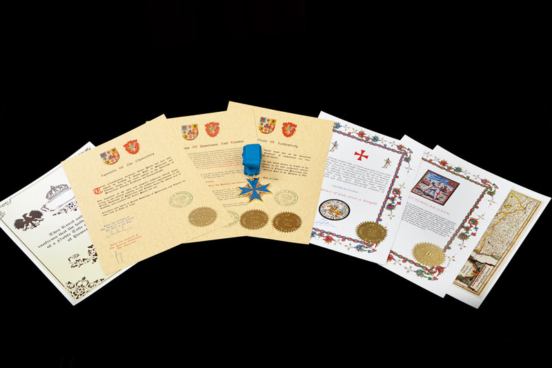 It is always good to offer genuine titles. Therefore, we offer to our clients a carefully selected choice of noble titles like Count or Countess and many more titles that you will only find in our website. Buy with confidence and enjoy our great service and fantastic documentation sets, always complemented with regalia and medals included already in the price. Remember: you are just click away from becoming a true member of the nobility and climb at full speed the social ladder.